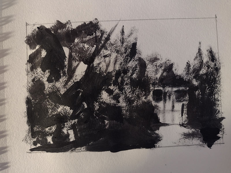 Od notanske studije (struktura) do koloriranog dizajna. Iz moje knjige skica. Za početnu inspiraciju uzeo sam fotografiju Minnewatera jer me privuklo raslinje koje skoro sakriva most. Sljedeći bi korak bio raditi sliku velikog formata na temelju ove kolorirane skice, a ne više gledanjem fotografije. No to je sljedeći korak koji opisujem u Slikarski proces 4 – Kompozicija: dizajn.